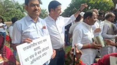 विधानसभा के बाहर खाली गुल्लक के साथ विपक्ष का प्रदर्शन