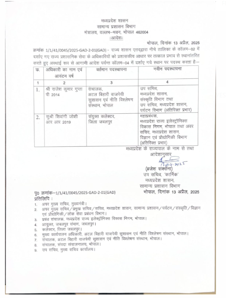 आदेश में जनजातीय कार्य विभाग के प्रमुख सचिव गुलशन बामरा को अटल बिहारी वाजपेयी सुशासन एवं नीति विश्लेषण संस्थान, भोपाल के मुख्य कार्यालय अधिकारी का अतिरिक्त प्रभार सौंपा गया है। इंदौर कलेक्टर आशीष सिंह को उनके वर्तमान दायित्वों के साथ सिंहस्थ मेला उज्जैन के मेला अधिकारी का अतिरिक्त प्रभार दिया गया है। इसके अलावा राज्य योजना आयोग के सदस्य सचिव एवं आर्थिक एवं सांख्यिकी आयुक्त ऋषि गर्ग को अटल बिहारी वाजपेयी सुशासन एवं नीति विश्लेषण संस्थान के संचालक का अतिरिक्त प्रभार सौंपा गया है।