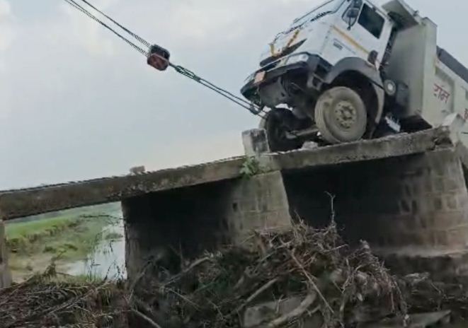 रेत भरे ट्रक का भार नहीं झेल पाया पुल, छतरपुर में ढहा पुल — बाल-बाल बचे लोग