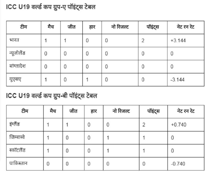 इंग्लैंड, ऑस्ट्रेलिया और अफगानिस्तान की जीत के बाद अंडर-19 वर्ल्ड कप पॉइंट्स टेबल ( Points Table) में बड़े बदलाव हुए हैं। ग्रुप-ए में भारत पहले पायदान पर बना हुआ है, वहीं ग्रुप-बी में इंग्लैंड, ग्रुप-सी में ऑस्ट्रेलिया और ग्रुप-डी में वेस्टइंडीज नंबर-1 है। पाकिस्तान इस हार के बाद सबसे नीचे चौथे पायदान पर है। आईए एक नजर U19 वर्ल्ड कप 2026 की पॉइंट्स टेबल पर डालते हैं-